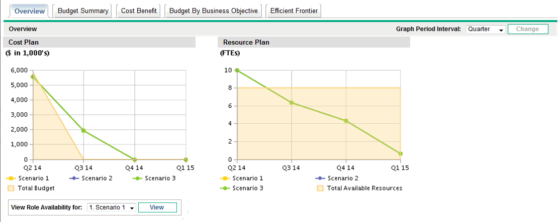 Unlike most of the other tabs, the Overview tab integrates all three scenarios into each of its two visualizations—the Cost Plan and Resource Plan graphs, as follows: