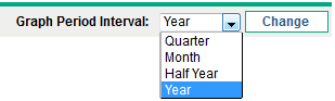 The graphs on all the tabs (except the Efficient Frontier tab) use the same time interval for their horizontal axes. To change the time interval, on any of these tabs select a new value in the Graph Period Interval field and click Change. See Figure 5-3. Graph Period Interval field.