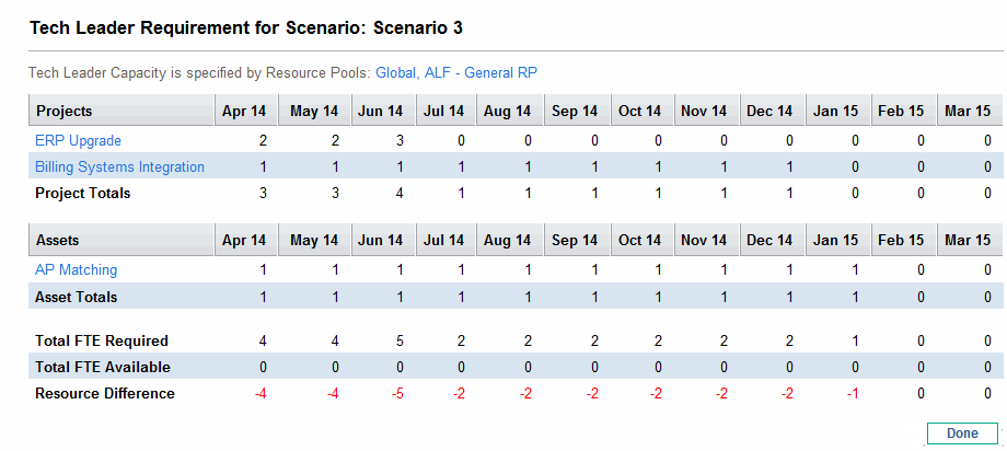 - Resource Difference is calculated as Total FTE Available - Total FTE Required.