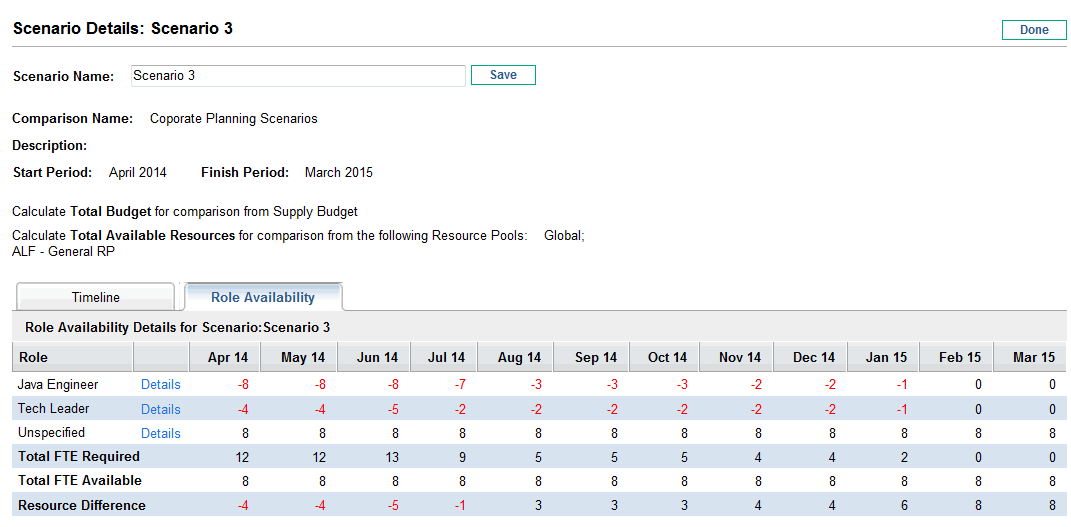 The Role Availability tab of the Scenario Details page displays a list of all the roles required for a particular scenario, along with how many resources are available across its periods. See Figure 5-11. Scenario Details page, Role Availability tab.