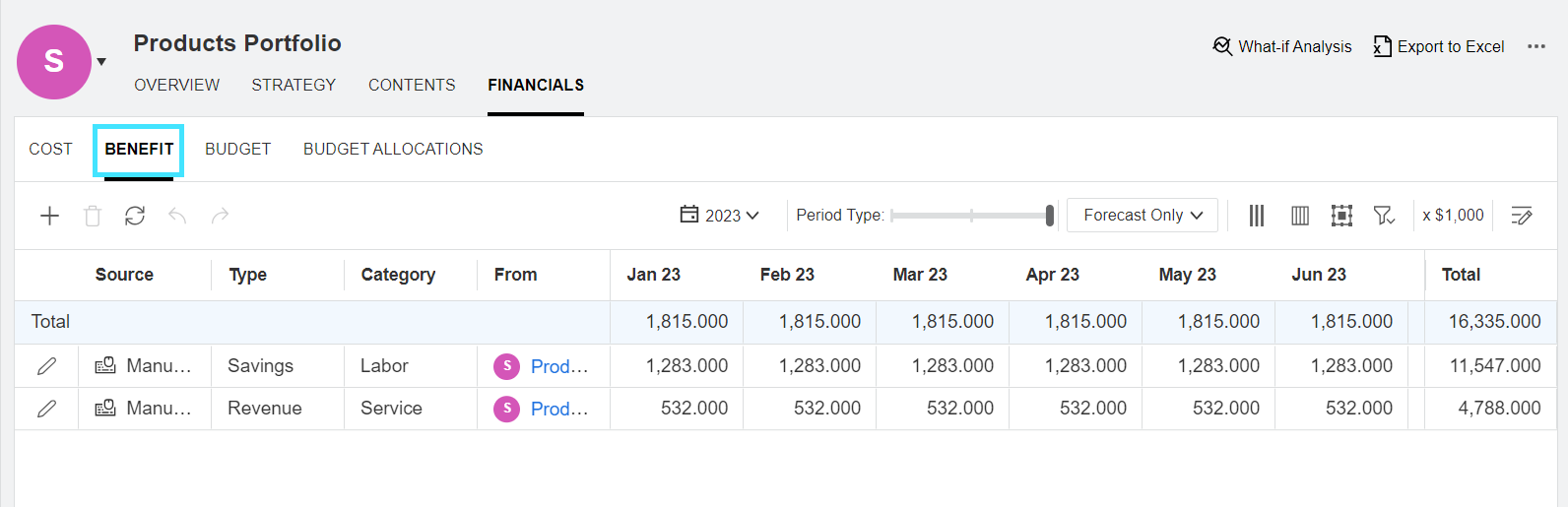 Benefit lines that are synchronized from the financial summaries of all the items in the portfolio: subportfolios, programs, projects, proposals, and assets. |