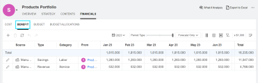 Portfolio managers can view, add, and edit a portfolio's benefits from Financials tab.