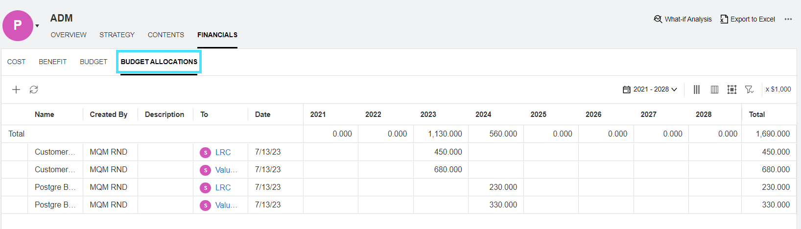 To view the details of budget allocated to portfolio contents, click the Budget Allocations tab.
