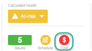 Cost and earned value health (short for cost health) is used to indicate the health of a project in terms of its work plan cost. Project cost health is indicated by the colored indicator in the project header.