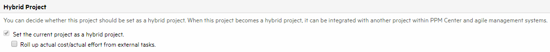 Only enabled when the Set the current project as hybrid project option is selected. If you select this option, actual effort and actual cost of external tasks are rolled up to the linked tasks. If you clear this option, actual effort and actual cost of external tasks are not rolled up to the linked tasks. |