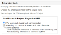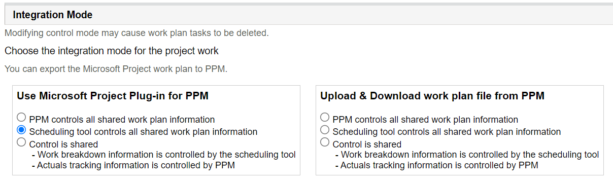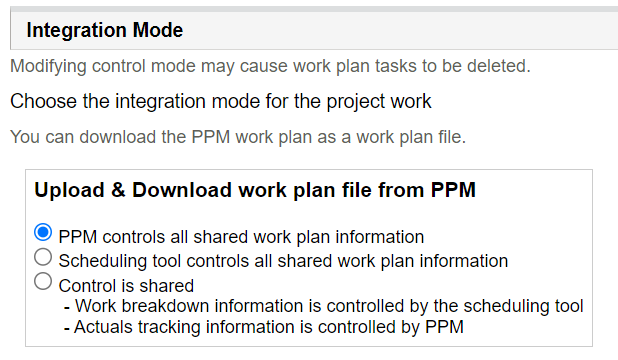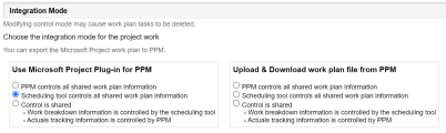 | MPP_FILE | When the parameter is set to MPP_FILE, the Integration Mode section of the Project Scheduling Integration policy in Project Settings shows the Upload & Download work plan file from PPM only. Project managers can only upload and download work plan file from PPM for the integration. |