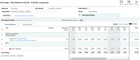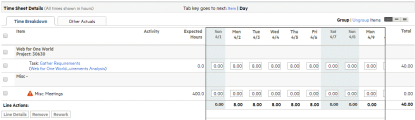 The area circled by the black rectangle is where you enter actual time you worked on each work item. The area has different displays depending on how your time sheet policy determines the way you enter time.
