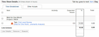 Note: If a task in a work plan has a specified activity, that task can have only that one activity and you cannot change it or add any other activity to it. If a task in a work plan has no specified activity, you can select and add one or more predefined activities to that task on the time sheet. Multiple activities are not transferred to the work plan, but their total time is.