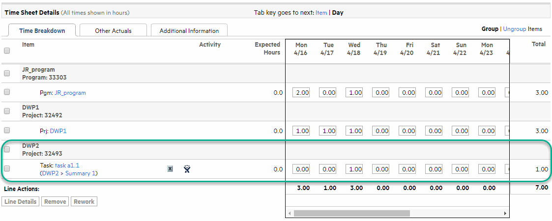 Such work items have a remove icon and an agile system logo added in their time sheet lines, so as to differentiate them from the work items that are directly added to the time sheet.