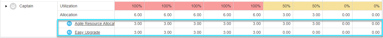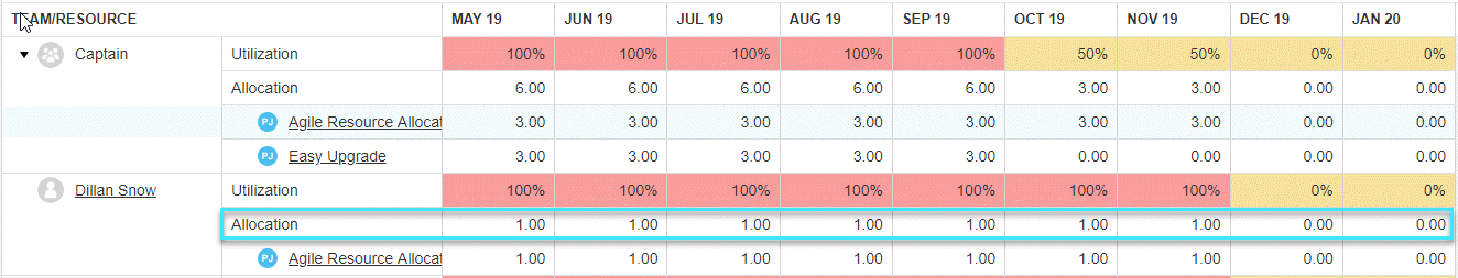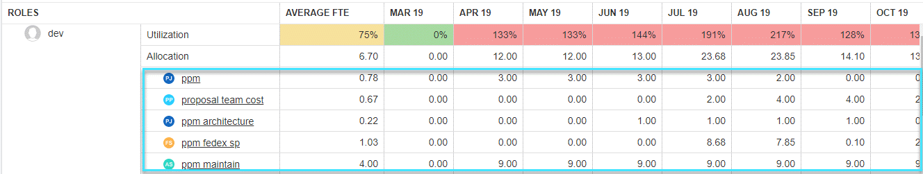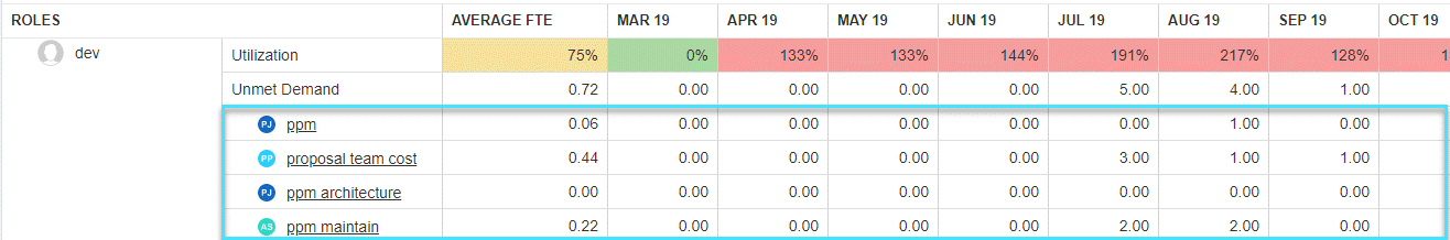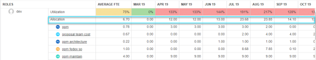 - Allocation: Sum of the effort that is assigned to the position roles where the team, its sub-teams, and its direct resources are assigned