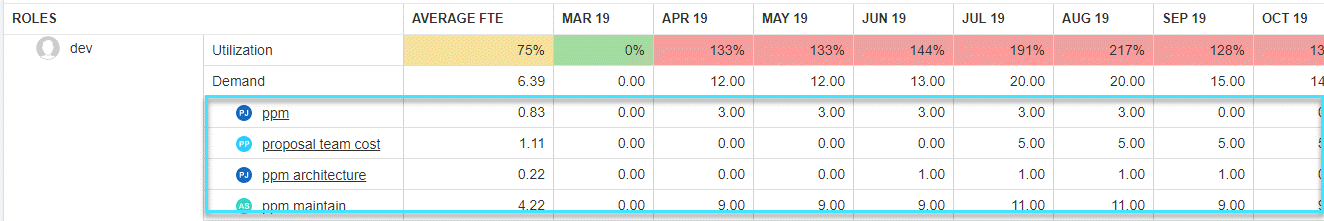 The Project view can show any combination of the following data for each entity (such as project and proposal) that has required demand from the team: