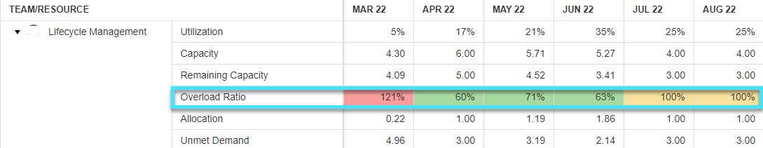 - Overload Ratio. For team and its sub-teams: Unmet demand / Remaining Capacity