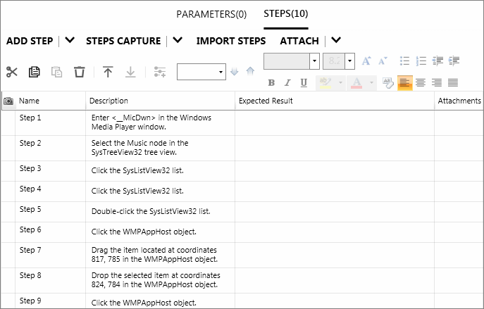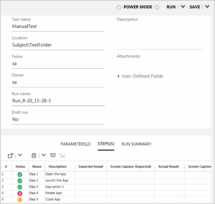 You open the Steps node to see details about each of the steps. The summary includes Status, Name, Description, Expected and Actual Results, Screen Captures, and Attachments.