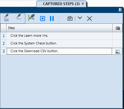 A grid representation of the steps showing: Step number. The sequential number of the step. Step. A textual description of the performed user action. When the Steps Capture session ends, this text is added by default to the step's description area. Alternatively, you can configure this to be added to the Step's Name field instead. For details, see Plan settings. You can also rename the step name. Capture. An icon