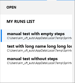 Allows you to choose a test to add to the My Runs List pane. If you have tests in the My Runs List pane, this option appends the selected tests to the tests in the list. For an OpenText Application Quality Management connection, the Open dialog box opens with the ability to filter and hide tests. |