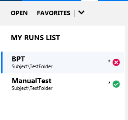 The list of tests available to be included in the next run. For OpenText Application Quality Management users, tests in the My Runs List pane correspond to instances of a configuration in OpenText Application Quality Management. These instances are referred to as tests throughout the product and this guide.