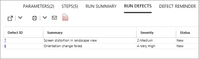 This tab displays a summary of the defects you submitted during your test run. You can also export, print, or email a summary of your run-time defects.