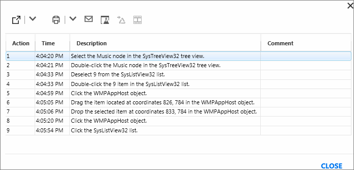 This area displays a summary of the user actions you performed during your run and any comments you added for each action. It also enables you to export, print, or email your user action information. This pane also allows you to export the run to a manual test, an OpenText Functional Testing test or a business component in OpenText Functional Testing.