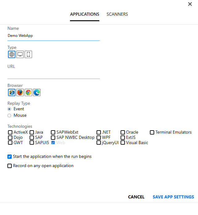 For OpenText Application Quality Management and OpenText Functional Testing users, when you select the Web Application button, the Settings area enables you to set options specific to Web applications. When you select the Desktop Application button, the Settings area enables you to set options specific to desktop applications.