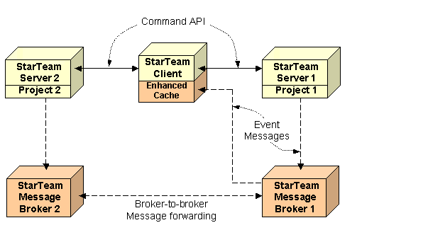 When the user opens Project 2 on StarTeam Server 2, assume that the client has selected an MPX profile that also specifies Message Broker 1. The client sends a subscribe message to Message Broker 1 registering its interest in messages regarding Project 2. Thereafter, StarTeam Server 2 sends all messages pertaining to Project 2 to Message Broker 2, which forwards them to Message Broker 1, and finally to the client. Even if the user closes Project 1 and, therefore, its connection to StarTeam Server 1, it continues to receive messages through Message Broker 1 during the client session.