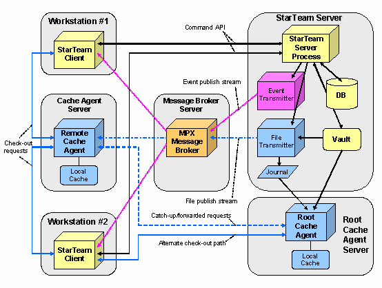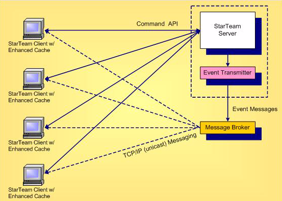 | Subscriber components | The subscriber components receive only those messages to which they have subscribed. Subscriber components receive messages through TCP/IP from the MPX Message Broker. StarTeam clients can receive and cache event messages. |