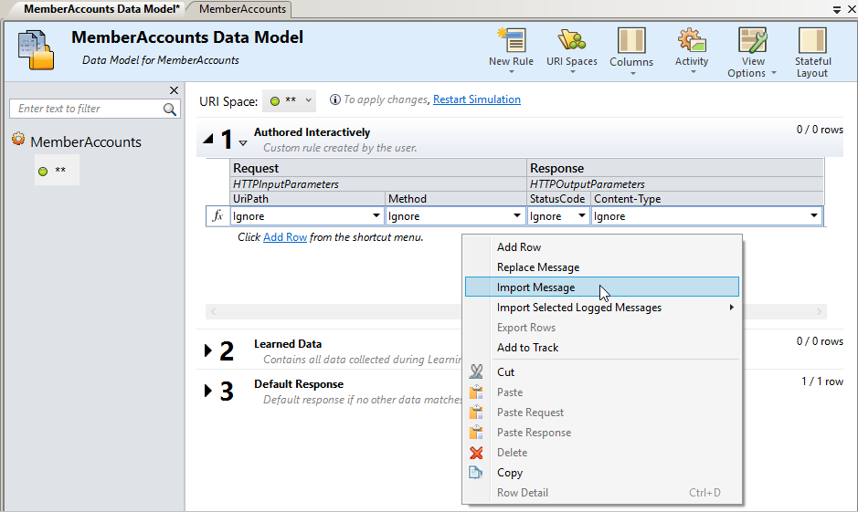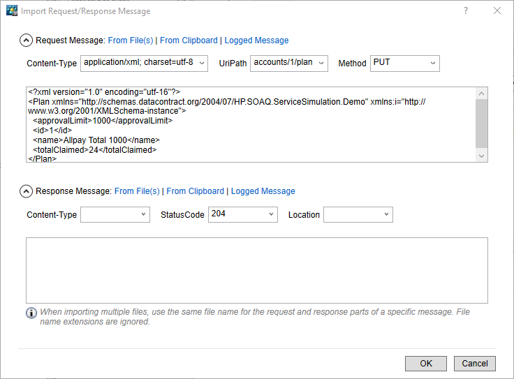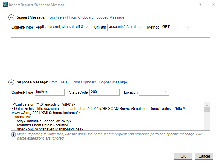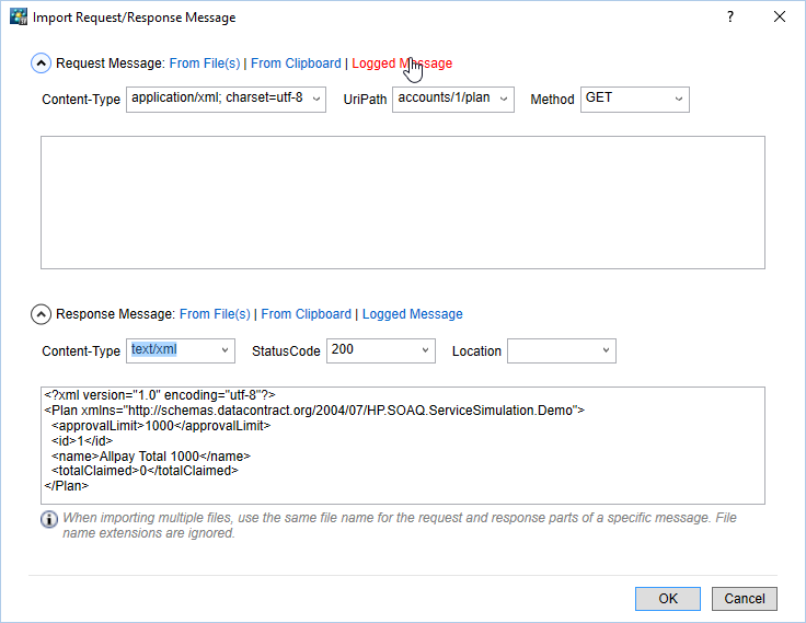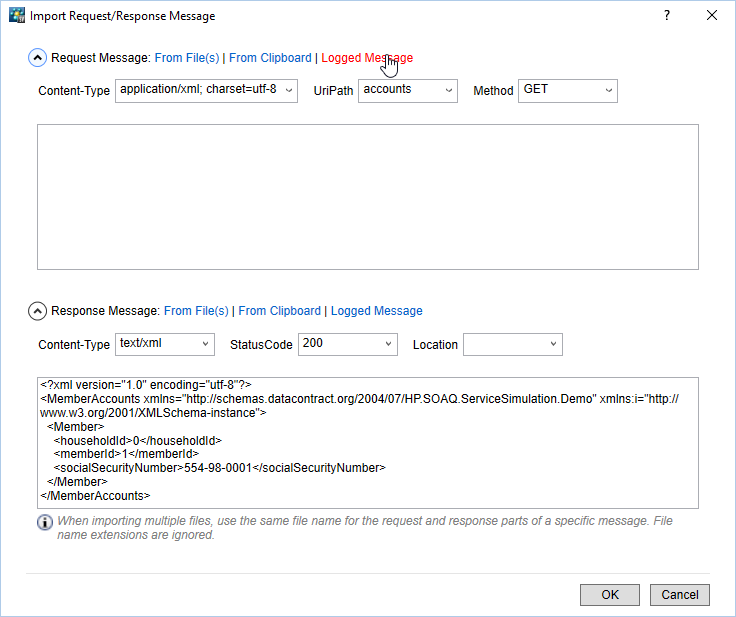 <?xml version="1.0" encoding="utf-8"?> <MemberAccounts xmlns="http://schemas.datacontract.org/2004/07/HP.SOAQ.ServiceSimulation.Demo"> <Member> <householdId>0</householdId> <memberId>1</memberId> <socialSecurityNumber>554-98-0001</socialSecurityNumber> </Member> </MemberAccounts>The Import Request/Response Message dialog box should now look like this: