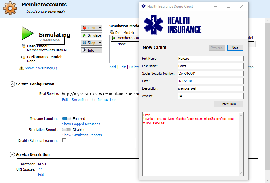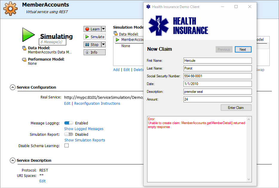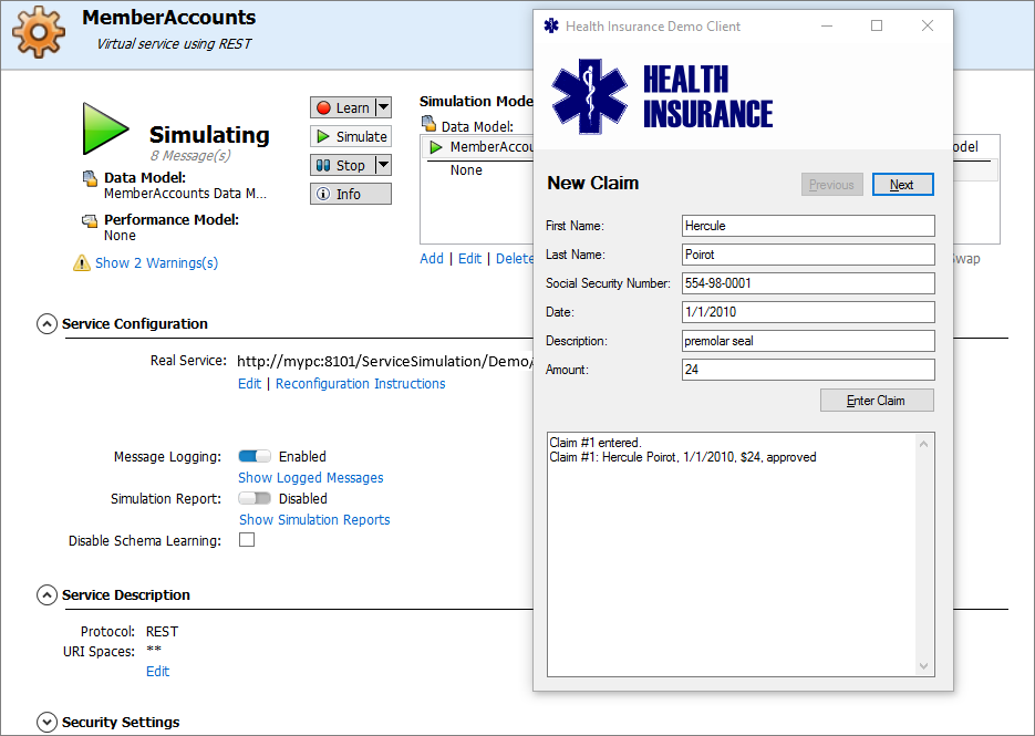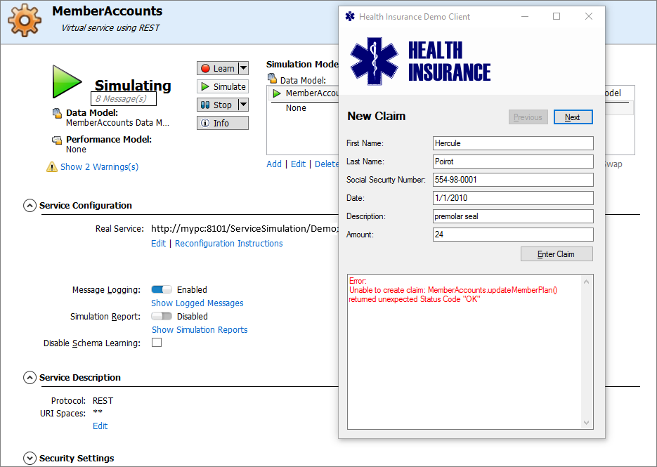 Test the simulation: Switch the virtual service to Simulating mode and send another request from the claim processing demo client.