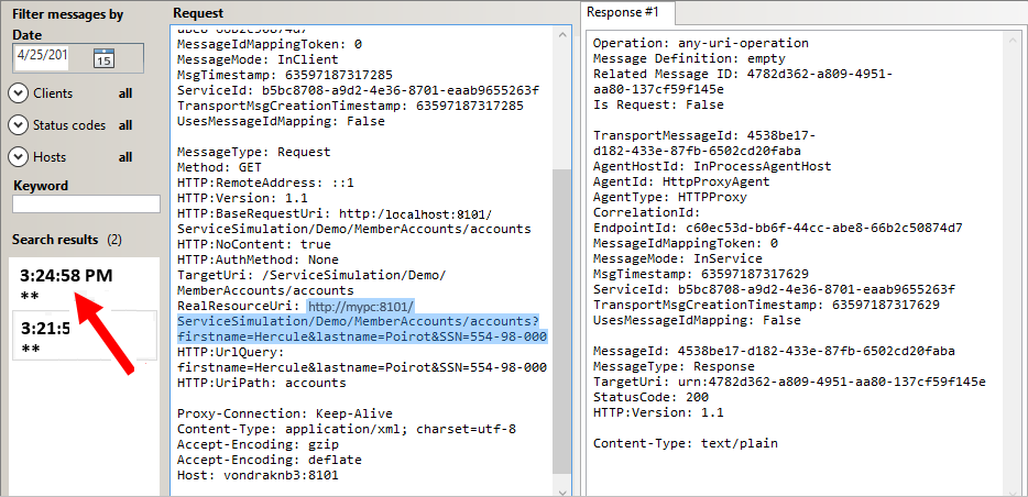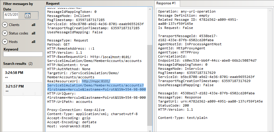 http://hostname:8101/ServiceSimulation/Demo/MemberAccounts/accounts?firstname=Hercule&lastname=Poirot&SSN=554-98-0001, and the response was just HTTP Status code 200 with no payload. -