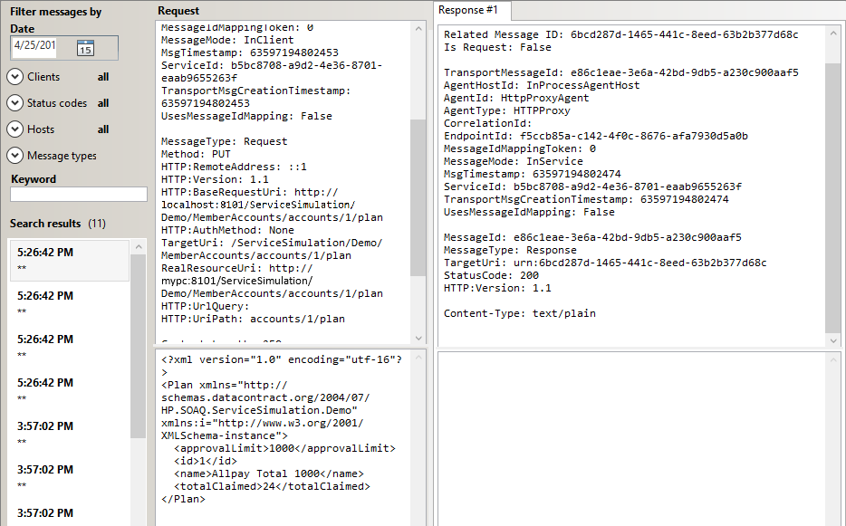 <?xml version="1.0" encoding="utf-8"?> <Plan xmlns="http://schemas.datacontract.org/2004/07/HP.SOAQ.ServiceSimulation.Demo"> <approvalLimit>1000</approvalLimit> <id>1</id> <name>Allpay Total 1000</name> <totalClaimed>0</totalClaimed> </Plan>