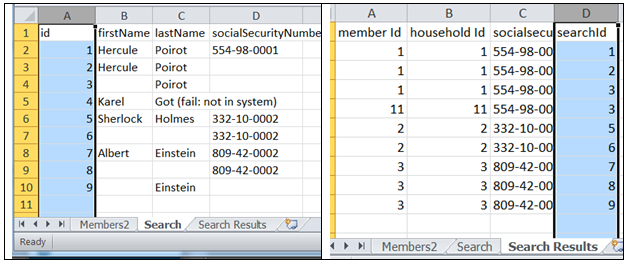 The following example shows the relationship between a search definition and the search result. A record in the Search worksheet is identified via its primary key ‘id’, and referenced from the Search Result worksheet via the foreign key ‘searchId’. This enables the return of two rows for a search with id 3, or zero rows for search of id 4.