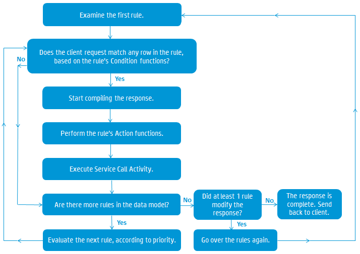 If there are additional, lower priority rules in the data model, OpenText Service Virtualization continues to the next rule, and starts the evaluation process again.