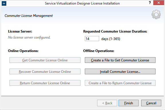 | Get Commuter License | Request a license from the license server that you can use offline for a specific number of days. |
