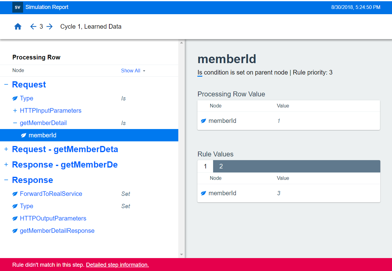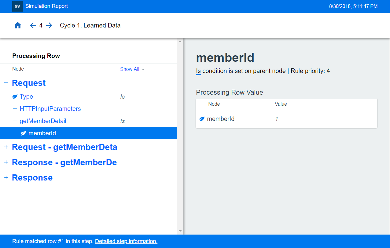 The simulation report provides a detailed look into the simulation process. The report shows the steps that were performed by the simulation engine when processing request data and generating a response, before sending the response back to the client. To learn more about how simulation works, see The Simulation Process.