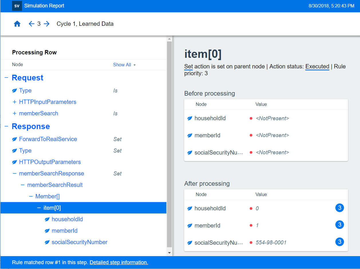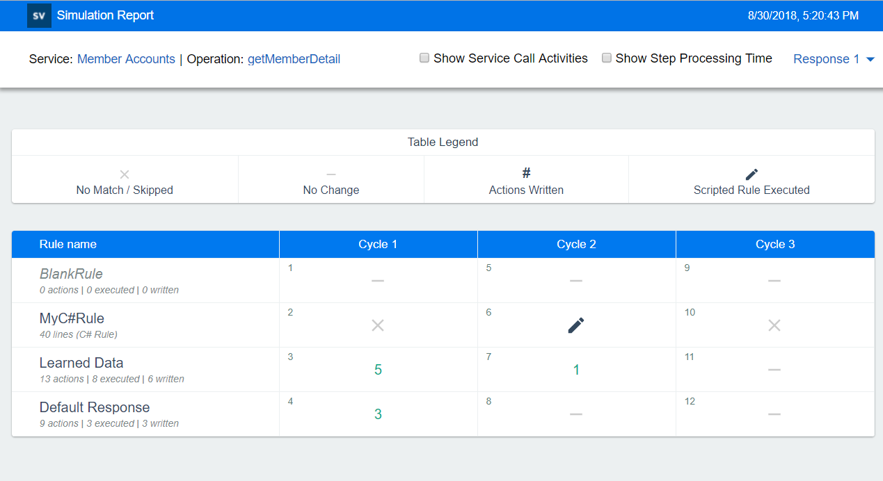 The simulation process is inherently complex. If your data model consists of many rules, conditions, and actions, it can be difficult to troubleshoot to find the source of unexpected results of the simulation. While Simulation Preview can assist you in assessing one rule at a time, the Simulation Report provides much more detail. You can see the complete sequence of steps performed to create the final response. The report also provides timing information which can help you identify performance bottlenecks.