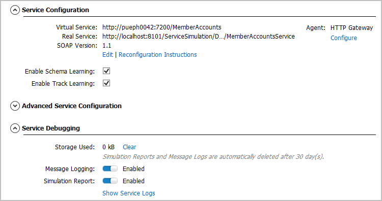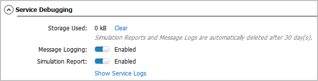 2. In the Service Debugging section, enable Message Logging and Simulation Report: