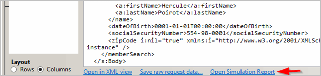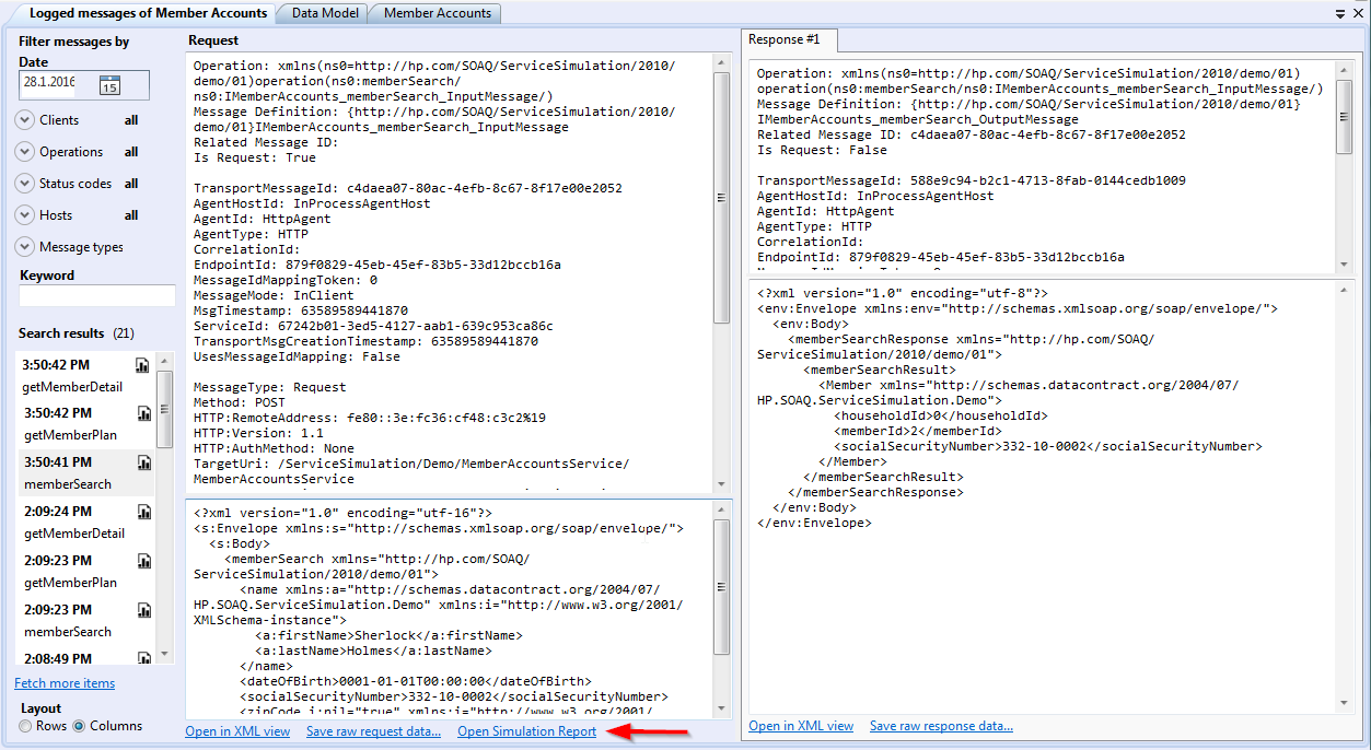 3. Send the request again. Messages are logged and the simulation report is generated.