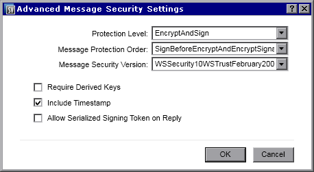 | Protection Level | The level of security applied to each message. This configuration has service scope levels. All messages must have the same security requirements. Options include: