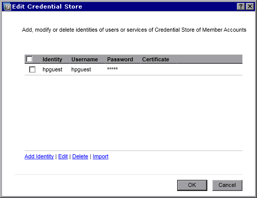This dialog box enables you to add, modify, or delete the users or certificates in the credential store for the selected service.