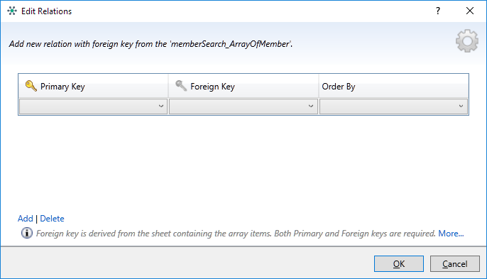 The drop-down lists display the columns in the external data source. The format of the keys is Order By: A drop-down list of the available columns in the child table to be used for ordering items within array. Select a value for each key to define the relationship. |
