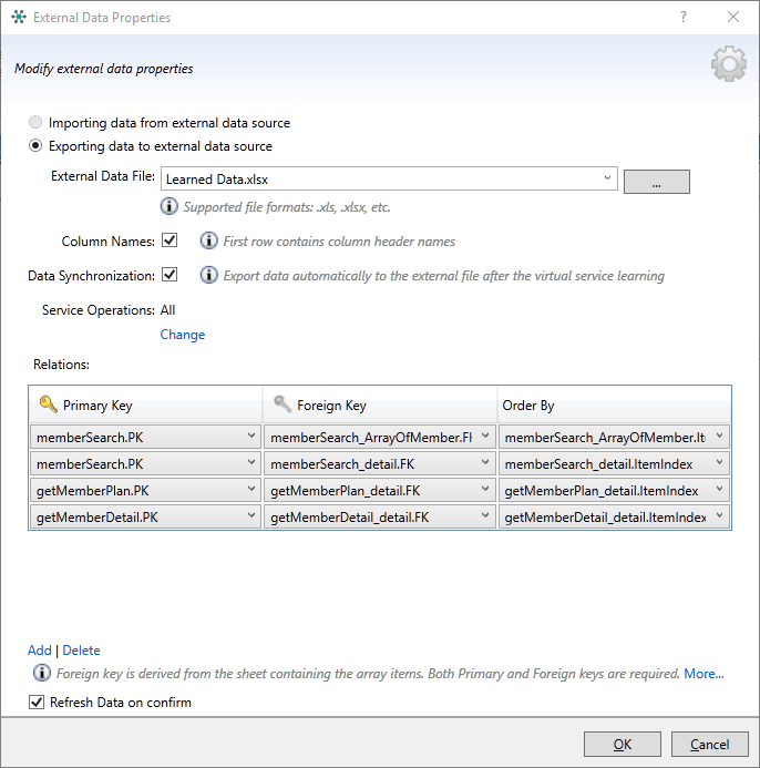 For import: Data is automatically re-imported from the external data source before each Simulation session. For export: Data is automatically exported to the external data source after a virtual service Learning session. |