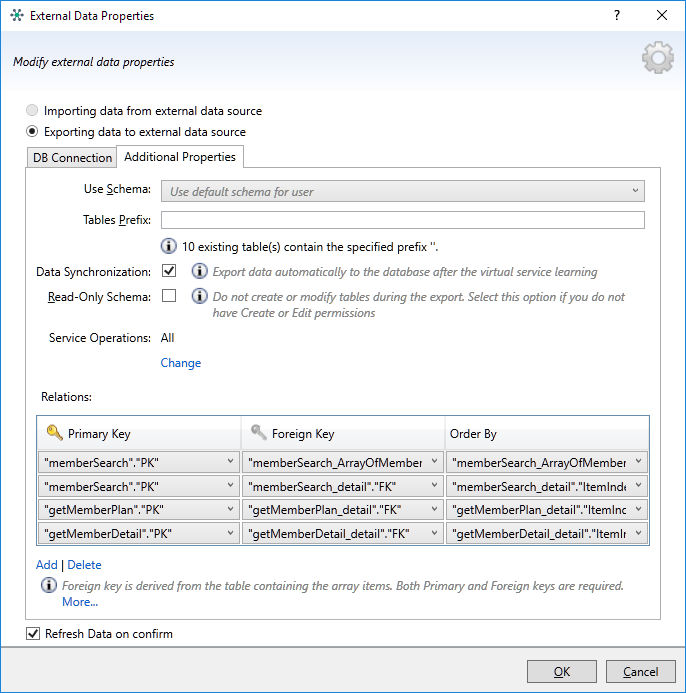 | Refresh Data on Confirm | Updates the data according to your new settings. For example, if you changed the setting from Import to Export, the data is exported to the external file when you click Finish. |