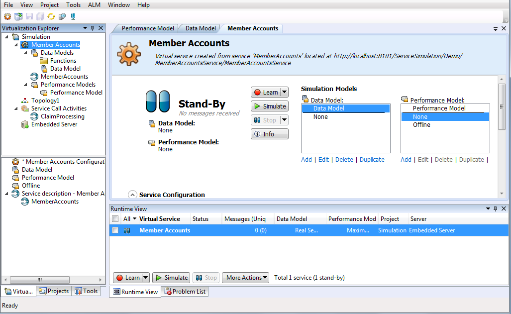 | Runtime View | Located in the lower pane of the window, displays the virtual services included in your open project. For details, see Runtime view. |