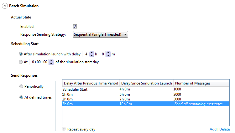 Enables you to define a schedule for sending responses back to the client application. Click an operation name to open the operation level view for the specific operation. For details, see Batch Simulation. |