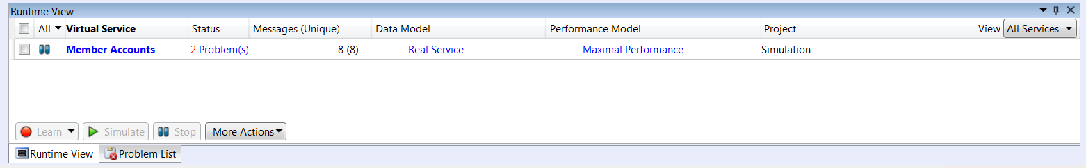 The Runtime view enables you to view and control all of the virtual services in your project. During a learning or simulation session, the Runtime view provides an overview of the communication through the virtual services.