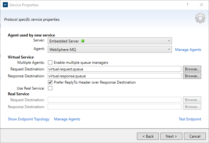Name of queue where the virtual service will send responses. If the client provides a ReplyToQueue message property, you can leave this field empty. Click Browse to select an actual destination or to virtualize a destination. Note: The Browse option is available only if your virtual agent has the necessary permissions, which are granted by the MQ administrator. For details, see MQ authentication. If the Browse option is unavailable, you can manually enter the response destination and click Test Endpoint to make sure it is correct. |