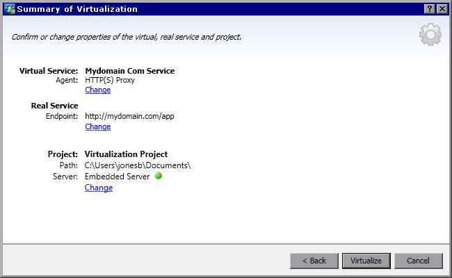 If you are creating a new virtual service from the Get Started page, a new virtualization project is created for the service. Click Change to modify the following details:
