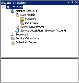 The Virtualization Explorer displays the logical structure of your virtualization projects. It shows the virtualization entities in your project, such as services, models, and topologies, in their hierarchical structure. It also displays information on the server associated with your project.