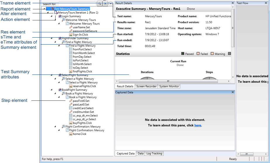 The diagram below for a GUI test, shows the correlation between some of the elements in the .xml file and the items they represent in the run results. These elements are similar for both tests and business components.