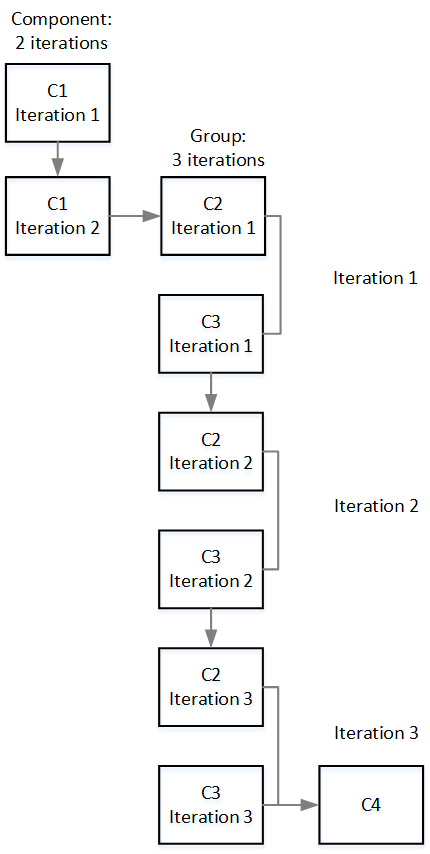 In this scenario, you group components C2 and C3 together as a group, and set the group to run for three iterations. Thus, the business process test runs in the following order:
