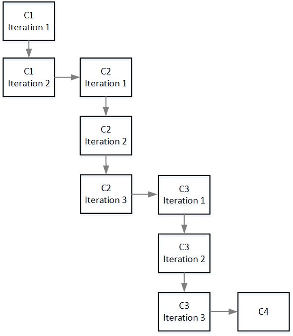 If you do not group any of the components, the business process test runs each component in sequence: C1 for its iterations or C2 for each of iterations.